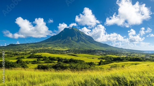 Fototapeta premium A large, green mountain rises against a blue sky with white clouds, with...