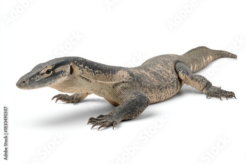 © Sasha, Naklejka premium A large grey and brown monitor lizard with intricate skin scales is captured crawling on a pristine white studio background.