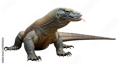 © aanz, Obraz premium A large grey lizard with prominent scales and claws is shown on a white background extending its forked tongue