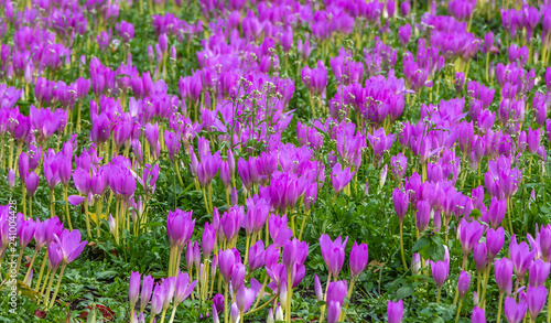 Naklejka premium A large group of beautiful purple and white crocus flowers with yellow stamens on a flower bed in a garden in autumn