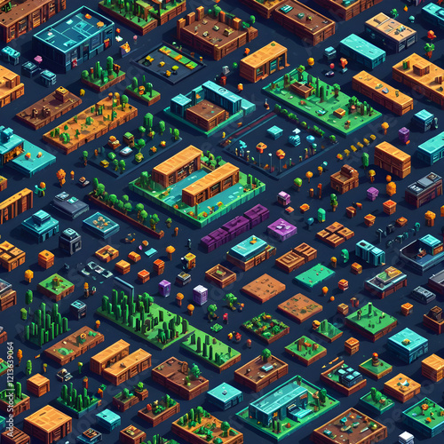 © shiv, Obraz premium a large group of pixel pixel city buildings and trees