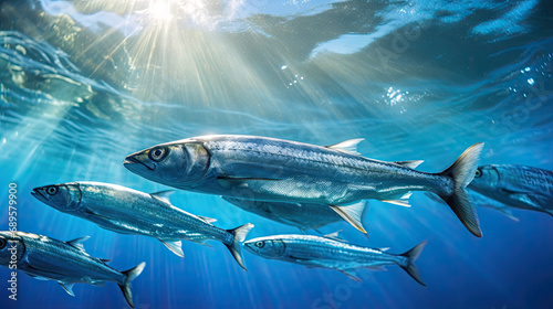 Fototapeta premium A large group of Sardines fish swimming in the ocean. Suitable for underwater or marine-themed designs, educational materials, wildlife conservation awareness, and nature documentaries.Underwater fis