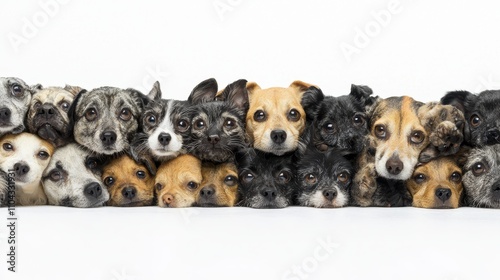 © Albert, Fototapeta premium a large group of small dogs of various colors and sizes looking at the camera against a white background