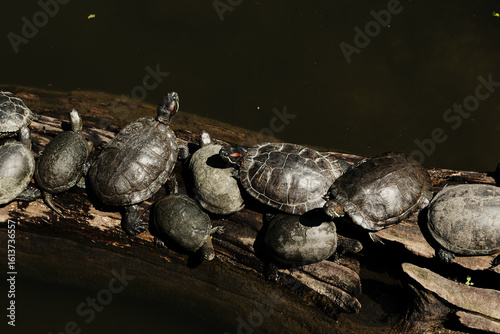 Obraz premium A large group of turtles sunbathing on a log in dark water. The reptiles cluster together on the wood surface, creating a natural and serene scene in a pond or zoo habitat.