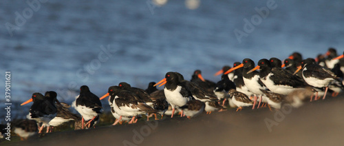 © Angelique, Fototapeta premium a large group oystercatchers resting at the sea wall along the water of the westerschelde sea with high tide in summer