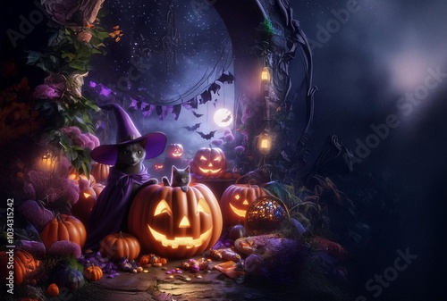 Naklejka premium A large Halloween pumpkin with a witch cat in a dark garden with Halloween...