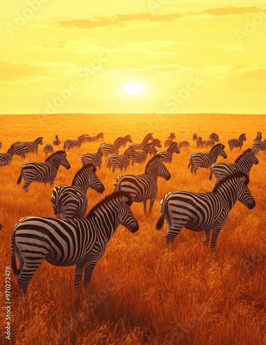 © ShinneProject, Fototapeta premium A large herd of zebras graze in a golden field at sunset, with the sun setting in the background.