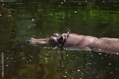 © coffeemill, Fototapeta premium a large hippopotamus floats in the water.