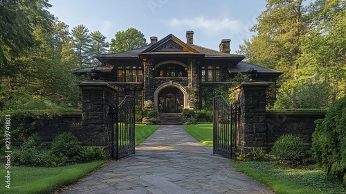 © Linus, Obraz premium A large house with a black gate and a stone wall
