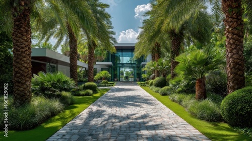 © Oleksandr, Fototapeta premium A large house with a long driveway and palm trees in the background. The house is surrounded by a lush green garden