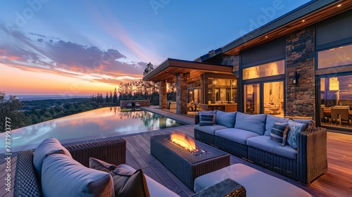 Fototapeta premium A large house with a pool and a fire pit on the deck. The house is situated on a hill overlooking a beautiful landscape