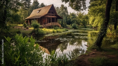 © Daisha, Fototapeta premium A large house with a porch and a pond in front of it