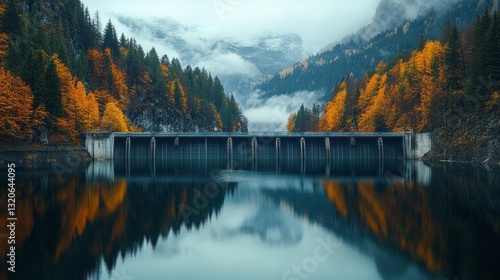 © Albert Kazakh, Fototapeta premium A large hydroelectric dam stands proudly as it reflects in the calm waters of a reservoir surrounded by vibrant autumn trees and majestic mountains under a cloudy sky