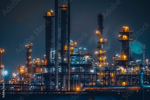 Naklejka premium A large industrial plant with many tall structures and a lot of lights