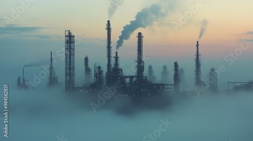 © SSTC AI Photo&Video, Fototapeta premium A large industrial refinery complex emits smoke as it rises through dense fog at dawn, creating a moody atmospheric scene.