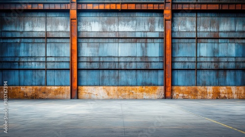 © BerkahStock, Fototapeta premium A large industrial space with a weathered metal wall and concrete floor, suitable for storage.