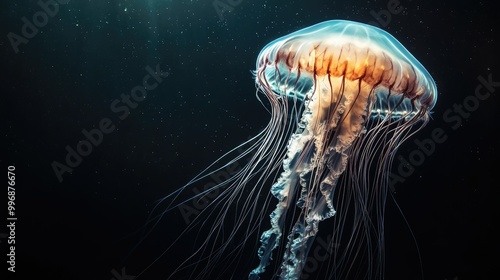 Fototapeta premium A large jellyfish floating majestically through the sea, with a dark background providing copy space. -