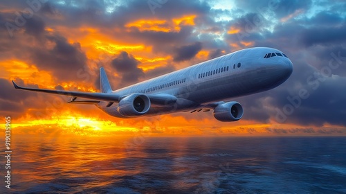© VISUAL BACKGROUND, Fototapeta premium A large jetliner flying over the ocean at sunset