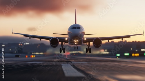 © progressman, Fototapeta premium a large jetliner flying through a cloudy sky at dusk on a runway at an airport with lights on
