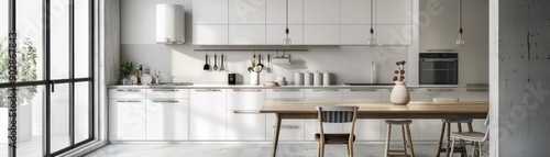 © Media Srock, Fototapeta premium A large kitchen with a white counter and wooden cabinets. The kitchen is very clean and well-organized
