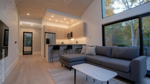 Fototapeta premium A large living room with a white table and a grey couch