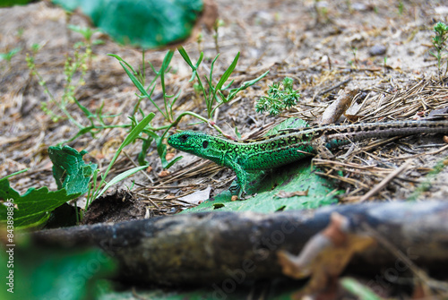 Fototapeta premium a large lizard runs along the forest floor in a summer forest