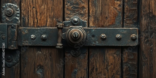 Fototapeta premium A large metal lock featuring a latch is positioned on the wooden surface of a...