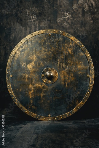Fototapeta premium A large metal shield sits on the floor