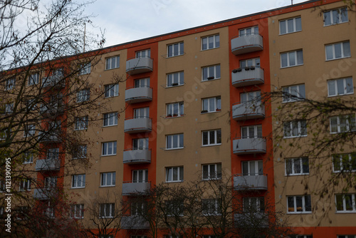 Naklejka premium A large, modern apartment building featuring numerous windows and spacious balconies overlooking the vibrant cityscape