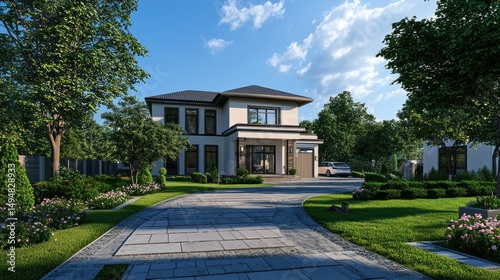 Fototapeta premium A large modern house with landscaping and a long driveway