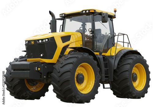 © PP Creative, Obraz premium A large modern yellow and black tractor with rugged tires and a detailed cabin isolated on a white background