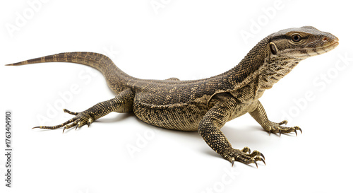 © Mawar, Fototapeta premium A large monitor lizard sticks out its tongue against a clean white background, showing detailed scales and a fierce expression.