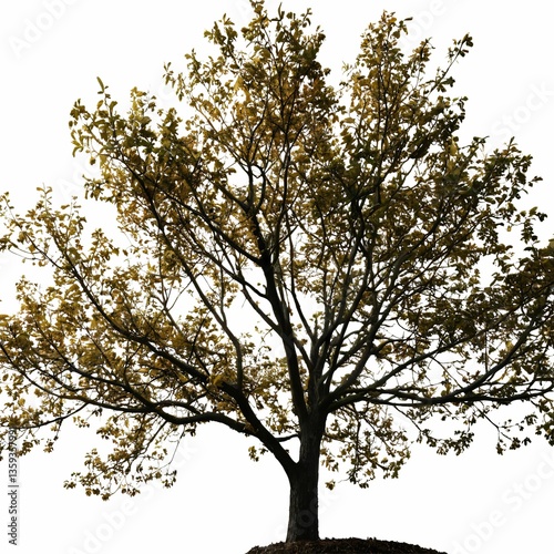 Fototapeta premium A large oak tree stands grandly against a white background with its dense...