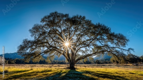 © Alohanongza, Obraz premium A large oak tree stands in a sunlit field with the sun shining through its branches under a clear blue sky