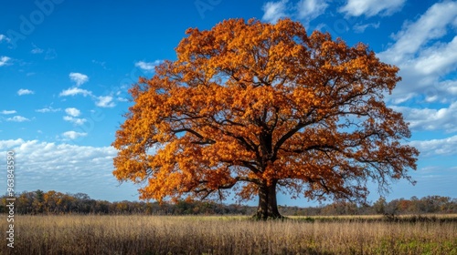 Fototapeta premium A Large Oak Tree With Golden Leaves Against A Blue Sky With White Clouds
