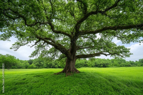 © Sanchai, Fototapeta premium A large oak tree with roots stretching out in all directions, showing centuries of strength