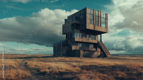 © dewboreas, Obraz premium A large, old building sits in a field of dry grass