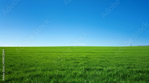 © wanchai, Fototapeta premium A large, open field of grass with a clear blue sky above. Concept of peace and tranquility