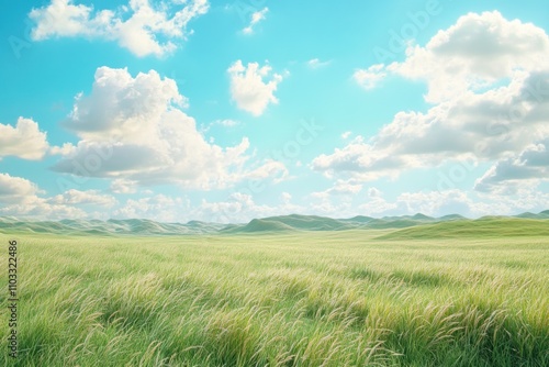 Fototapeta premium A large, open field with a blue sky and fluffy clouds