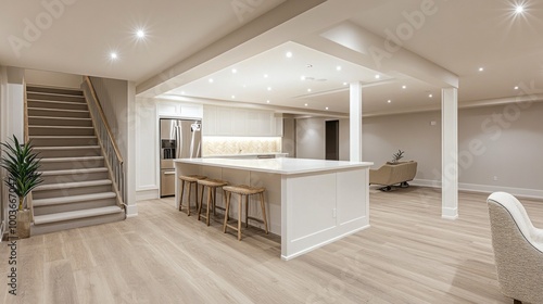 Fototapeta premium A large open kitchen with a white island and a white refrigerator