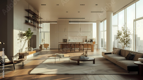 Naklejka premium A large, open living room with a kitchen and a dining area