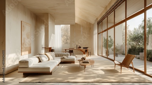 © G.Go, Fototapeta premium A large open living room with a white couch, a coffee table, and a few chairs