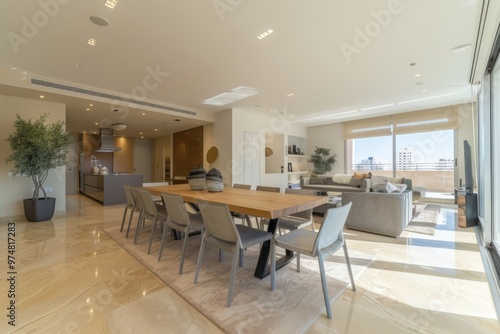Fototapeta premium A large, open room with a wooden floor and a large table in the center,generative ai image