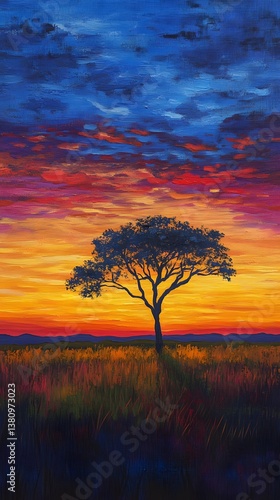Obraz premium A large, open savannah with a lone acacia tree silhouetted against a colorful...