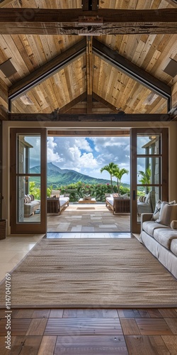 © KerXing, Obraz premium A large open space with a view of mountains and a patio. The room is filled with furniture, including a couch and a chair