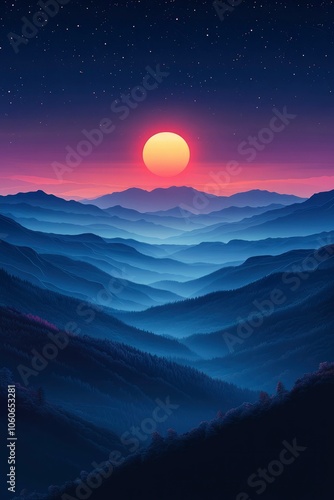 Fototapeta premium A large orange sun setting behind a layered mountain range with a starry sky