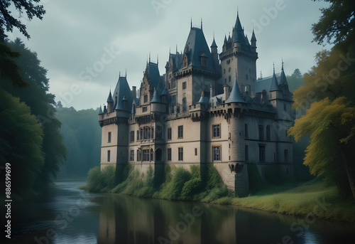 Fototapeta premium A large, ornate castle or palace surrounded by a moat and dense forest in a dark, moody atmosphere