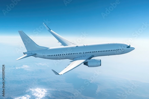 © Fotograf, Obraz premium A large passenger jet flies through a clear blue sky, with no clouds or obstacles in sight