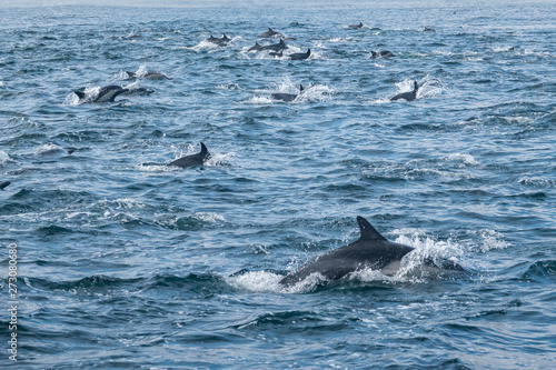 Fototapeta premium A large pod of Short Beaked Common Dolphins (Delphinus capensis) chases a...