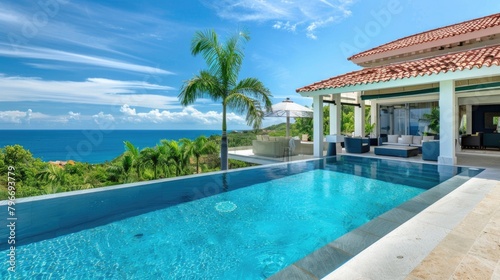 © Hope, Fototapeta premium A large pool with a white umbrella and a view of the ocean